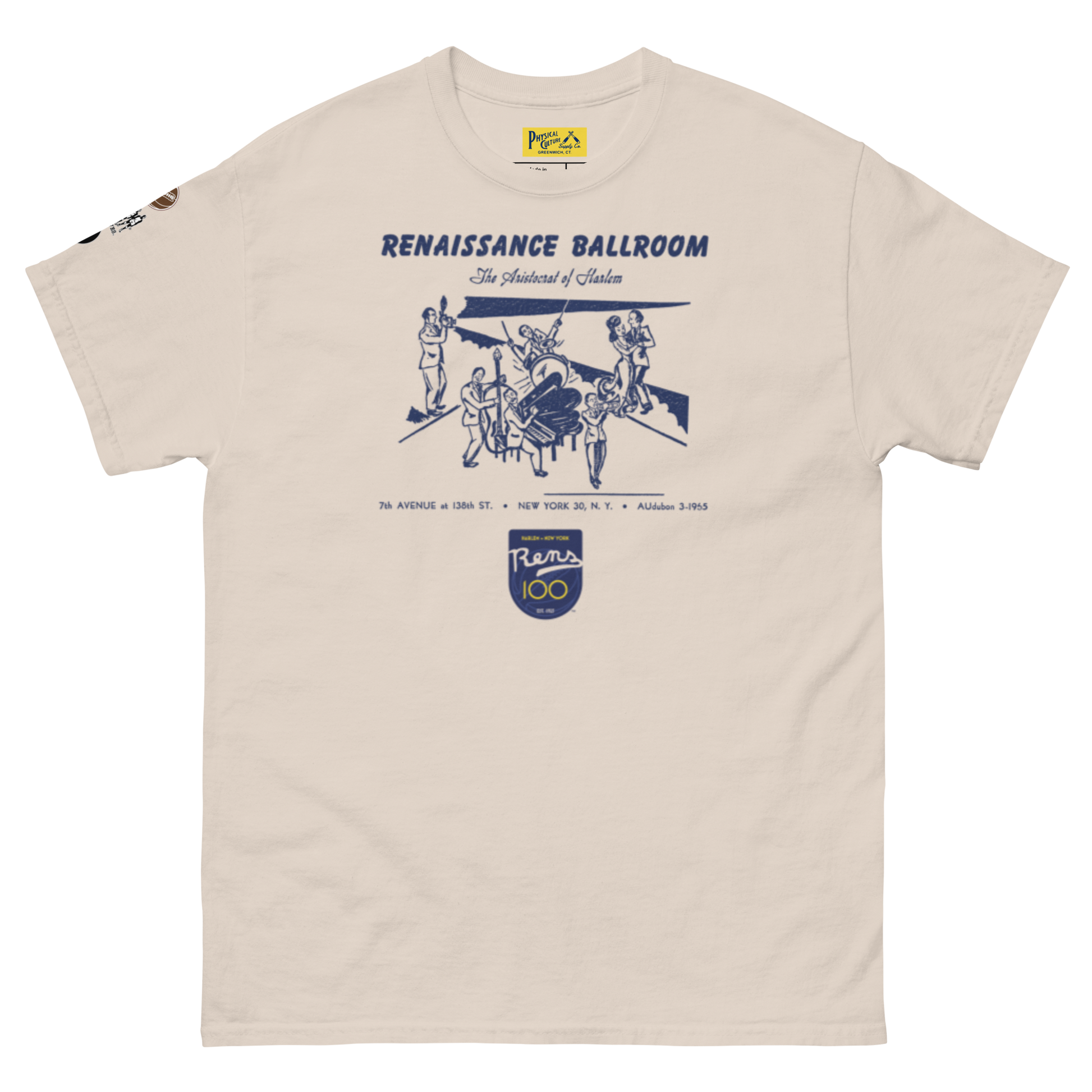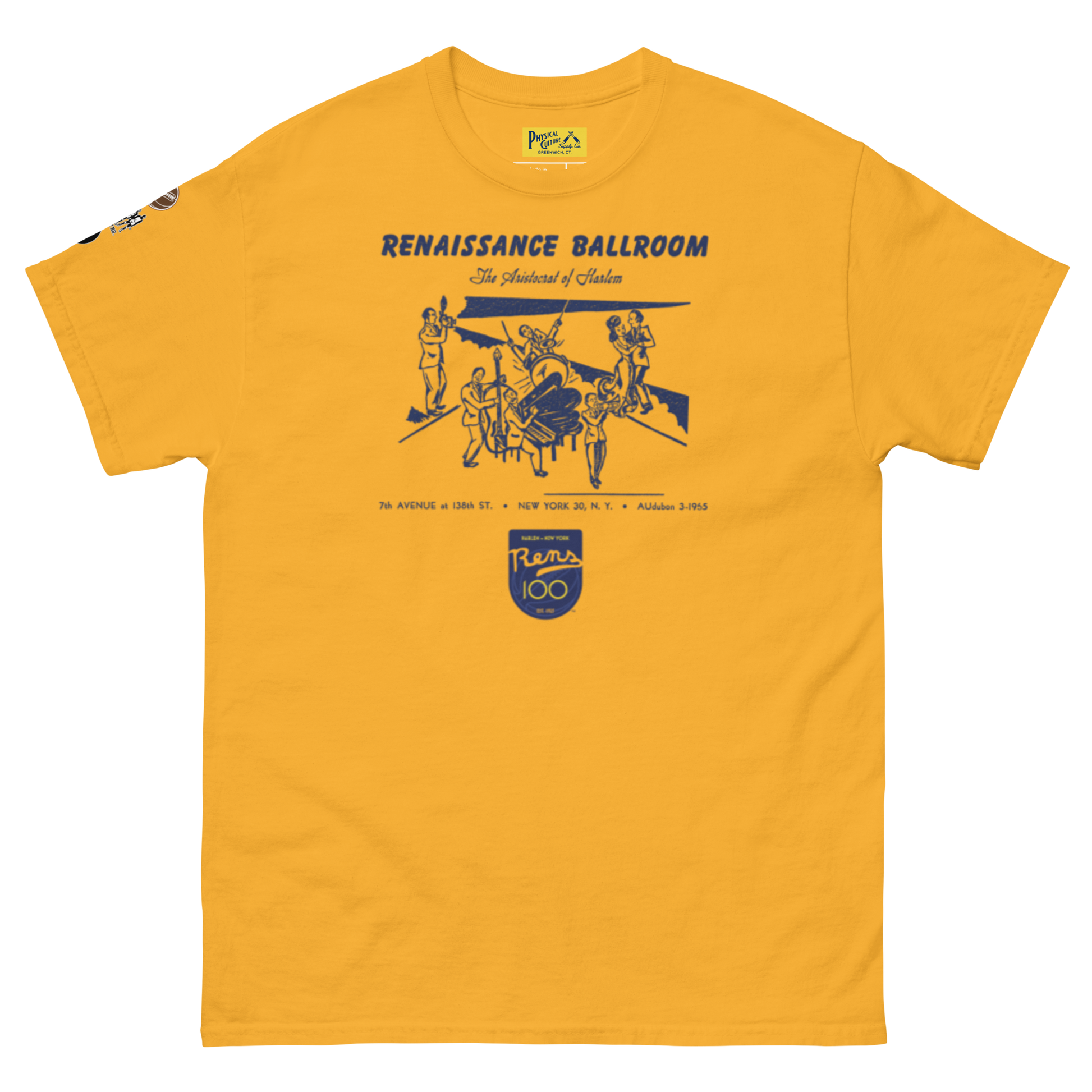 The vintage graphic from a program promoting the Renaissance Ballroom in Harlem on a short-sleeve tee shirt with Physical Culture Supply Co. private label, part of the Black Fives collection of African American basketball teams. Nicknamed "The Aristocrat of Harlem" for its stateliness, luxury, and grace, the venue was the home court of the New York Rens, the first Black-owned, all-Black, fully-professional basketball team in history.