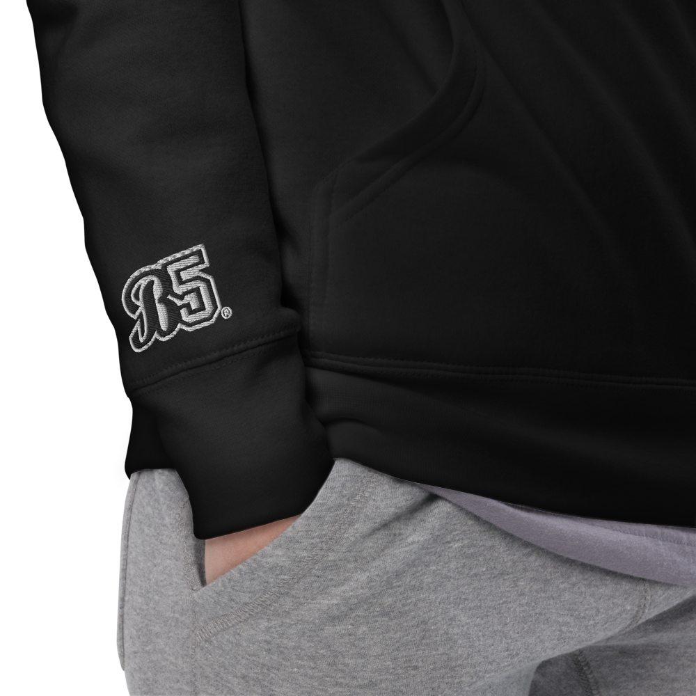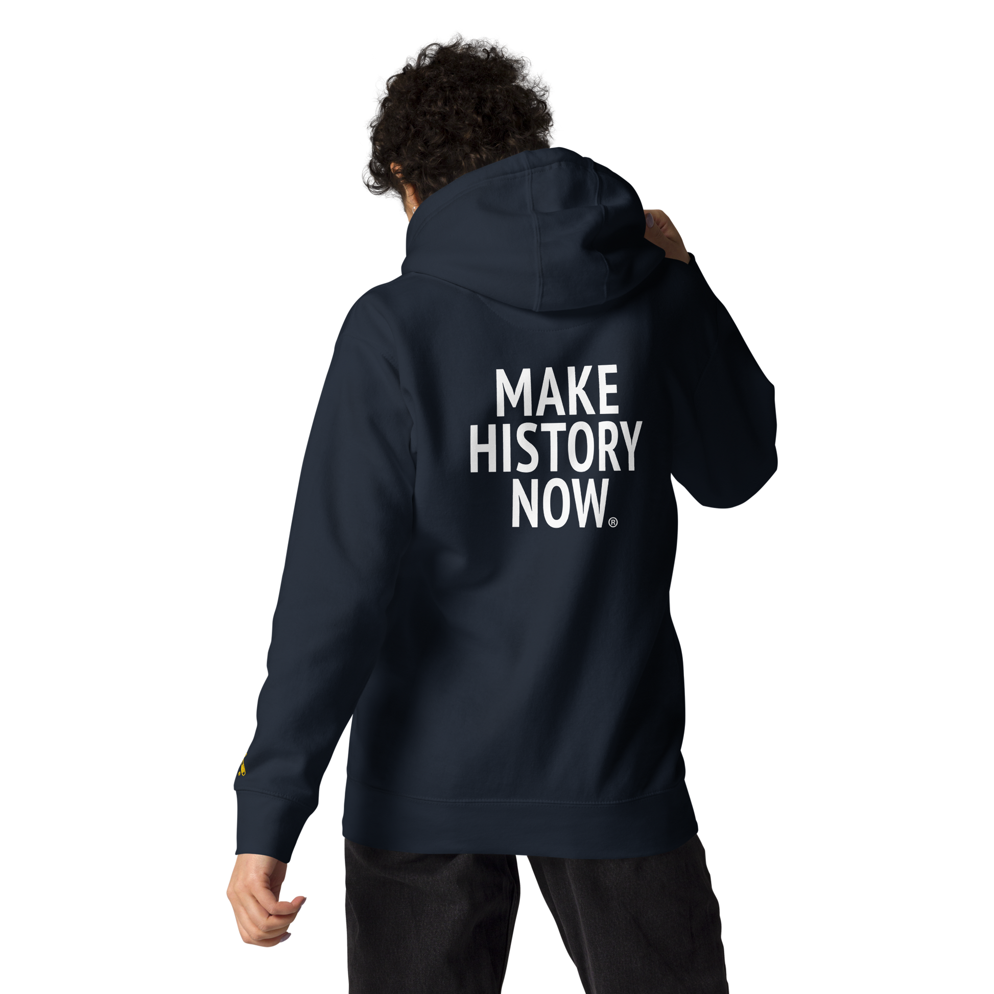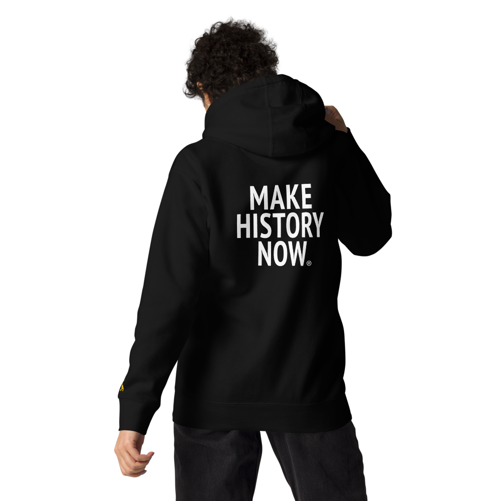 Flex the large scale BLACK FIVES brand logo on the front of this quality hoodie with large MAKE HISTORY NOW slogan on the back. Accented with sleeve embroideries.