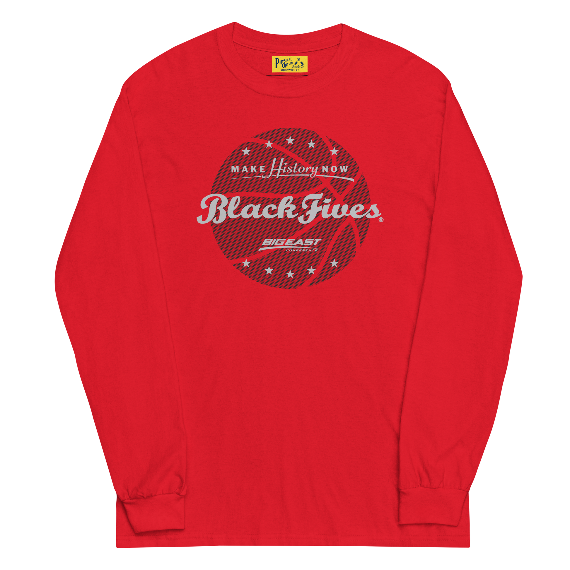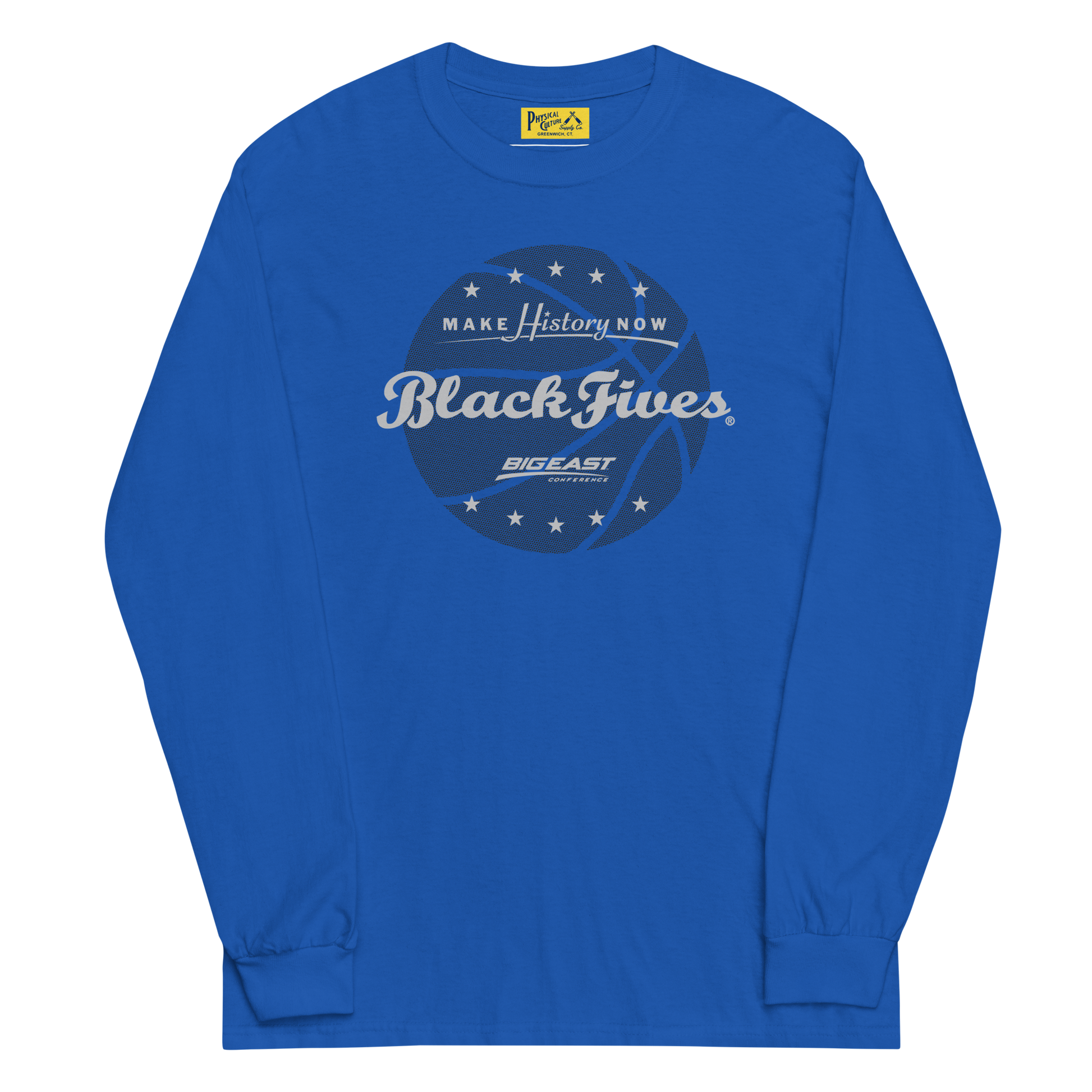 Black Fives x BIG EAST commemorative partnership logo with the Make History Now slogan on a cotton long-sleeve tee shirt to celebrate BHM2024 and honor early African-American basketball teams paired up with BIG EAST member schools.