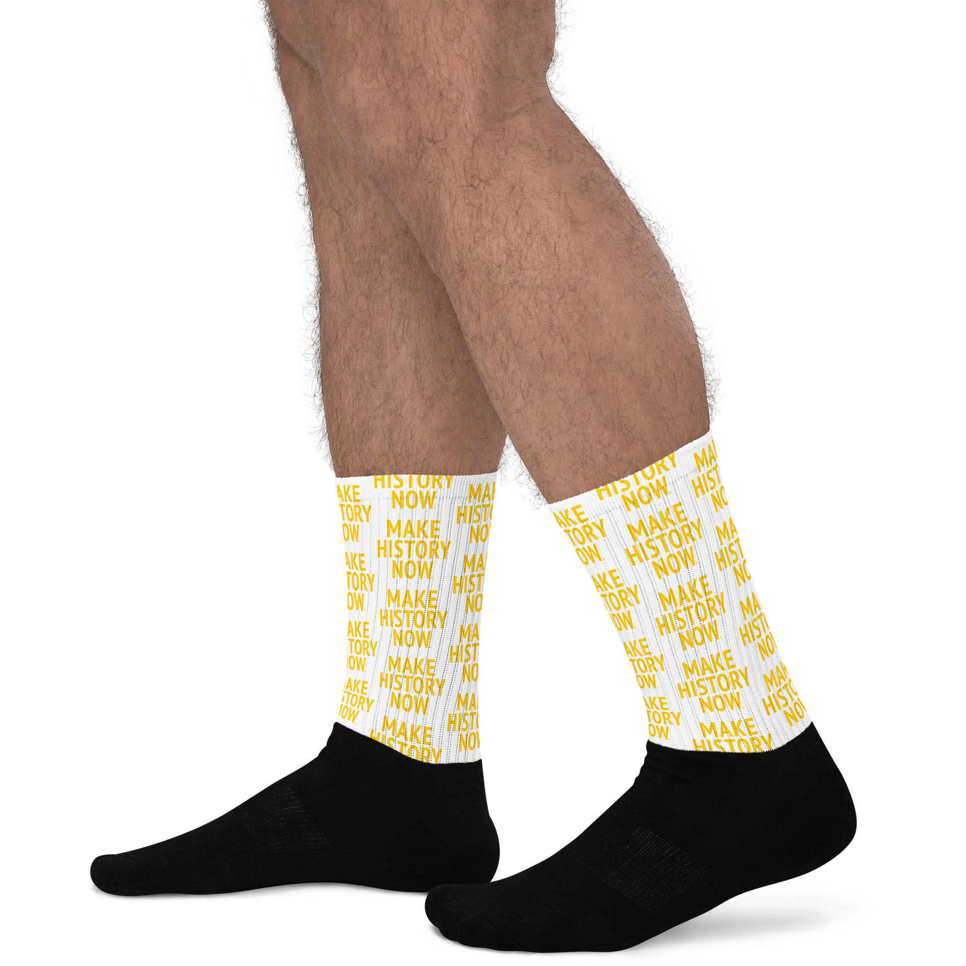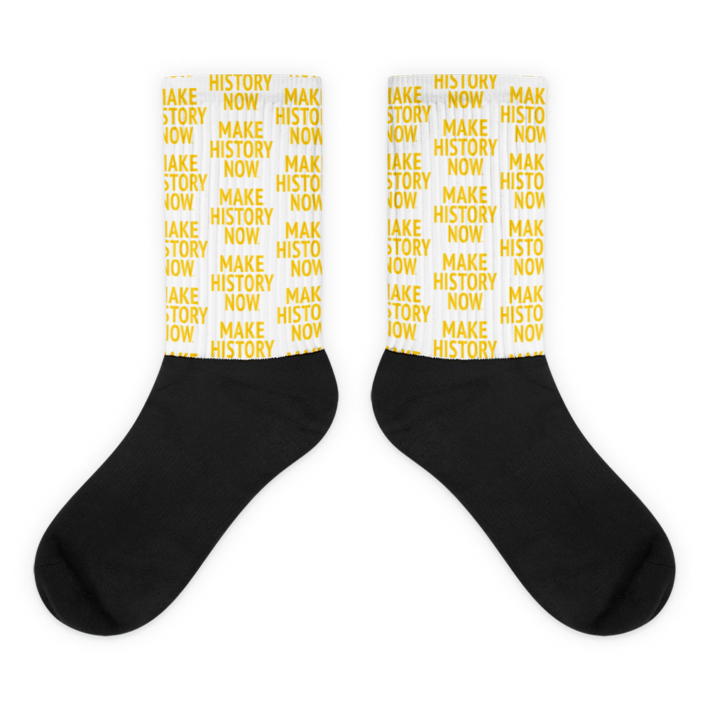 These socks are extra comfortable thanks to their cushioned bottom. The foot is black with our MAKE HISTORY NOW® graphic printed along the high ankle and lower calf.