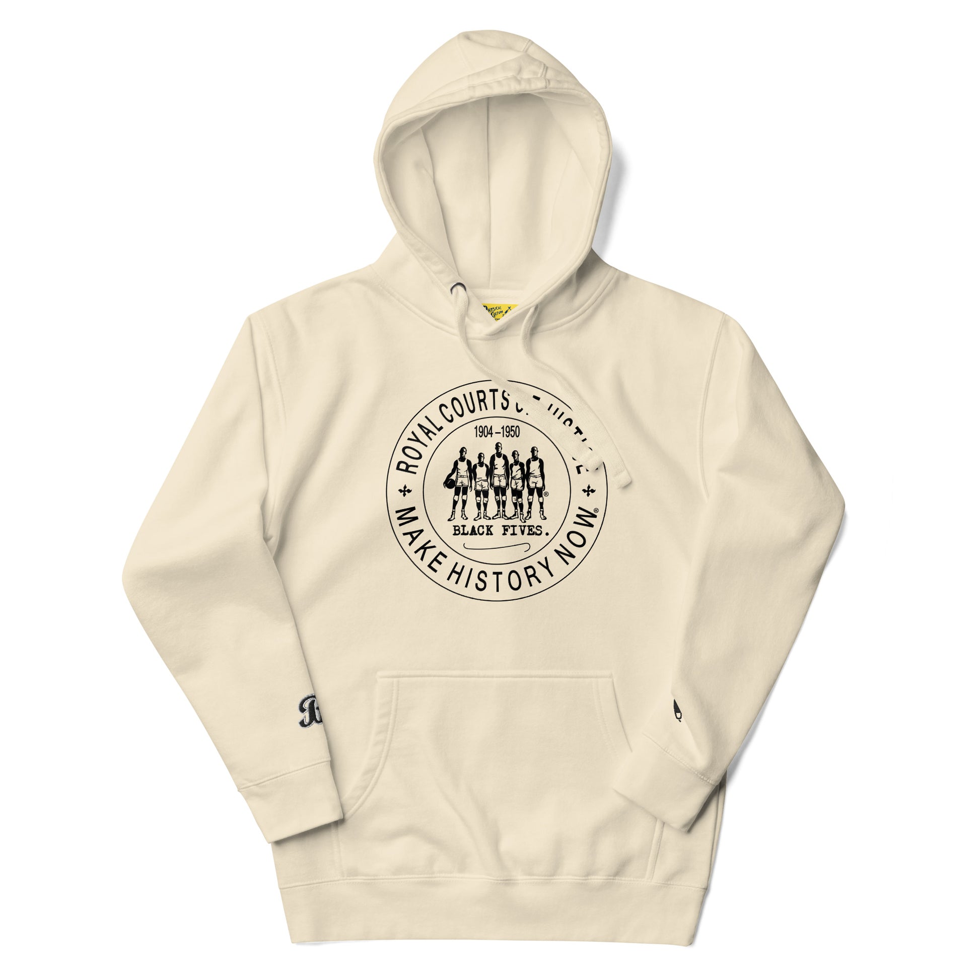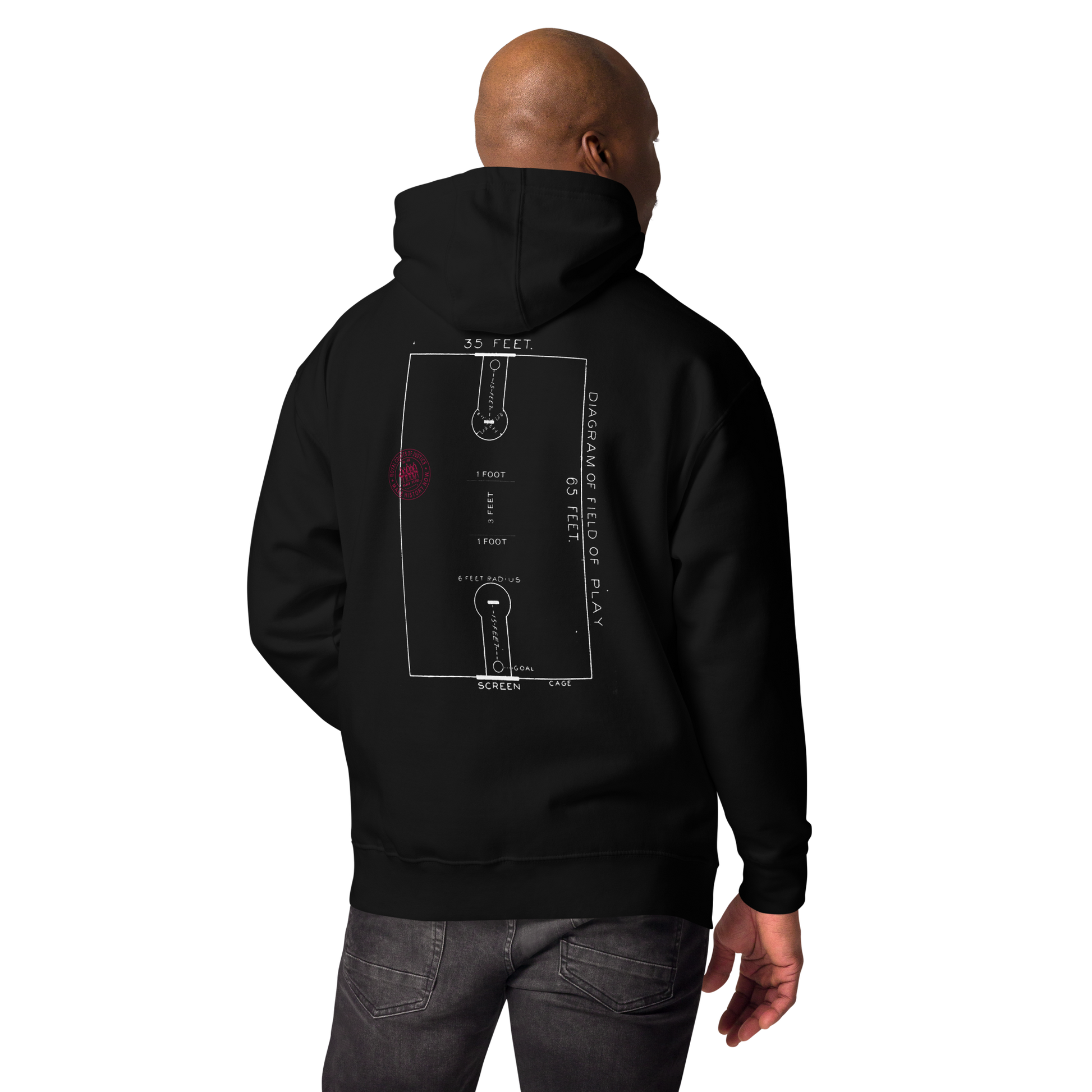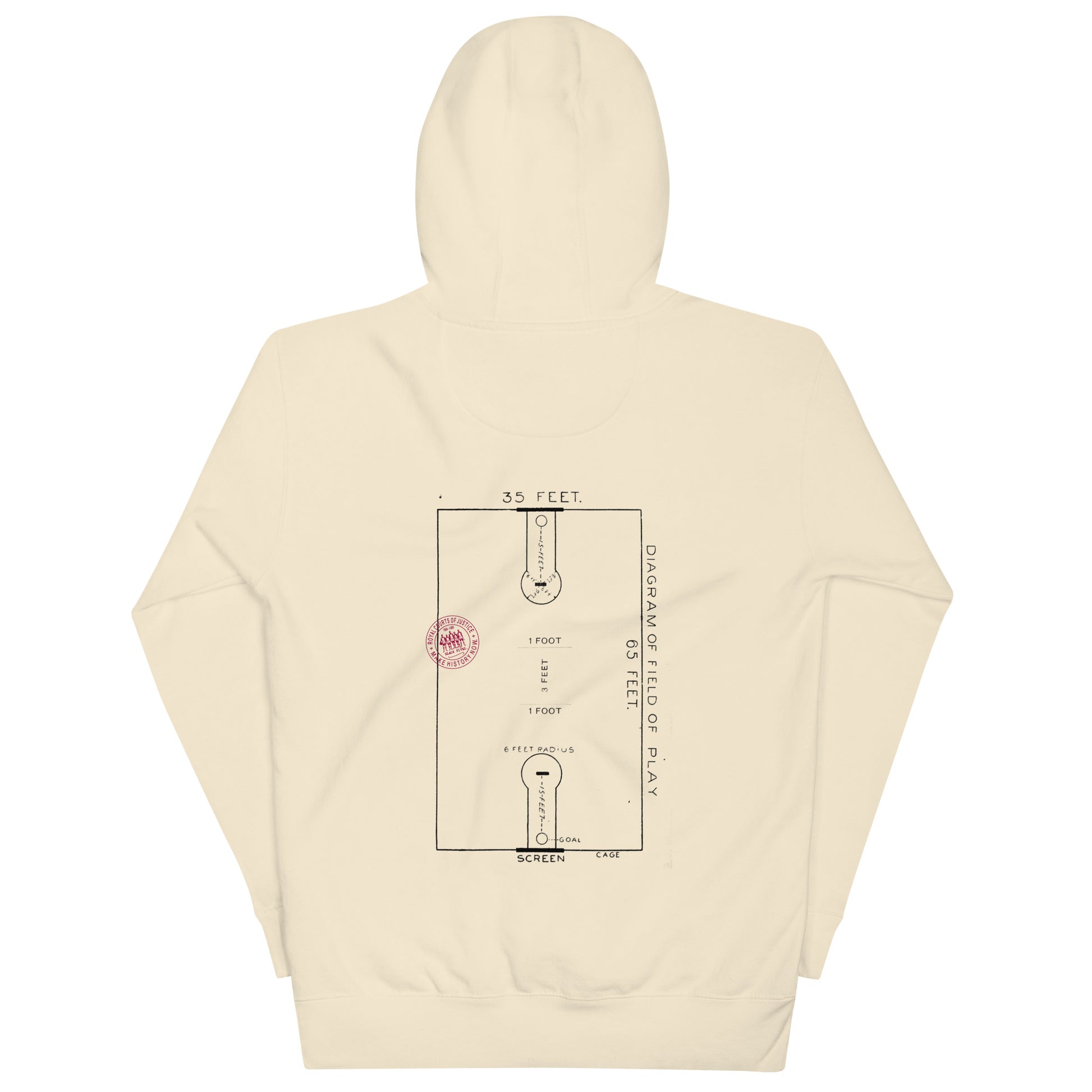 The front graphic on this hoodie is inspired by the official vintage ink stamps used by the Royal Courts of Justice in England to certify legal documents, and we gave that concept a new meaning with our own Royal Courts of Justice (RCOJ) Collection. The reverse side graphic shows an actual vintage basketball court diagram from our archives, which even specifies the cage dimensions, of the same type upon which early African American basketball players once played. Here is a brief video sharing where and how the collection was conceived: