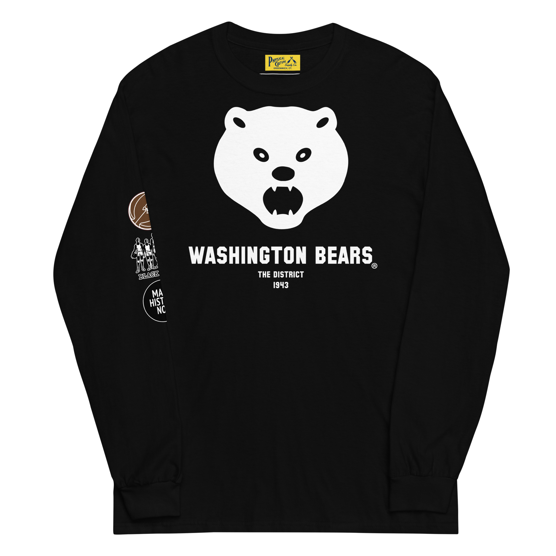 Vintage logo long-sleeve tee shirt with Physical Culture Supply Co. private label, part of the Black Fives collection of African-American basketball teams.